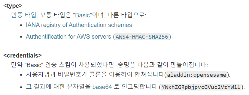 Authoriazation : <type> <credentials> 형식으로 주어진다.
