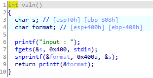 알아보자 버퍼에 복사하는 거라고 한다. 여기서는 s에 있는 값을 format으로 가져오는 거겠지. 0x400만큼. 사이즈가 정해져있다는 점이 중요하다.