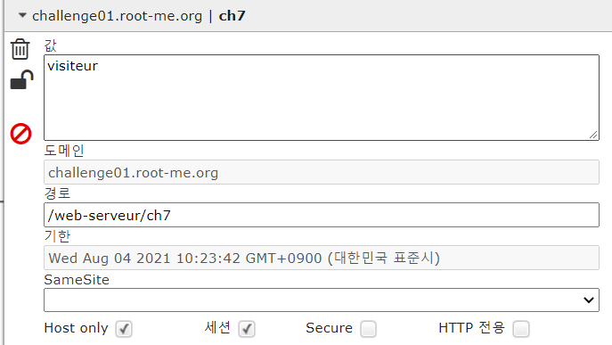 쿠키값이 visiteur 로 이전에 c와 같은 값으로 설정되어 있다.